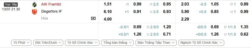Bảng Tỷ lệ kèo bóng đá AIK vs Degerfors IF