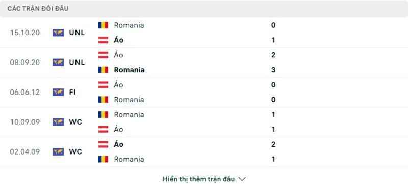 Thành tích đối đầu của Áo vs Romania