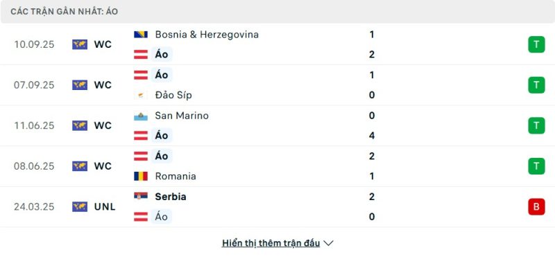 5 trận gần nhất của Áo: W-W-W-W-L
