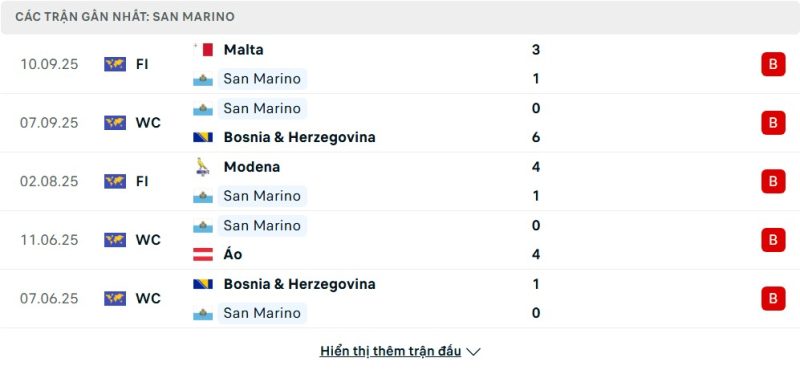 5 trận gần nhất của San Marino: L-L-L-L-L