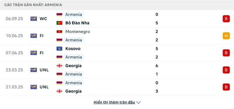 5 trận gần nhất của Armenia: L-D-L-L-L