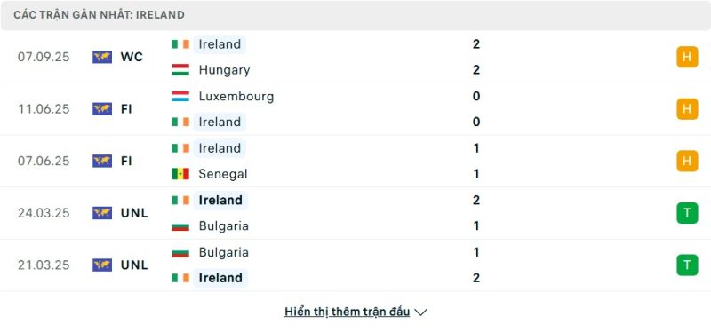 5 trận gần nhất của Ireland: D-D-D-W-W