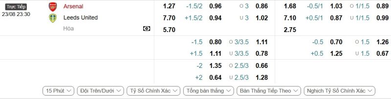 Bảng Tỷ lệ kèo bóng đá Arsenal vs Leeds United