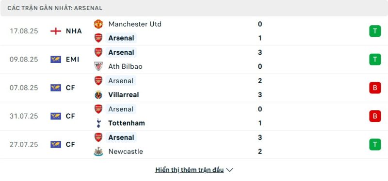 5 trận gần nhất của Arsenal: W-W-L-L-W