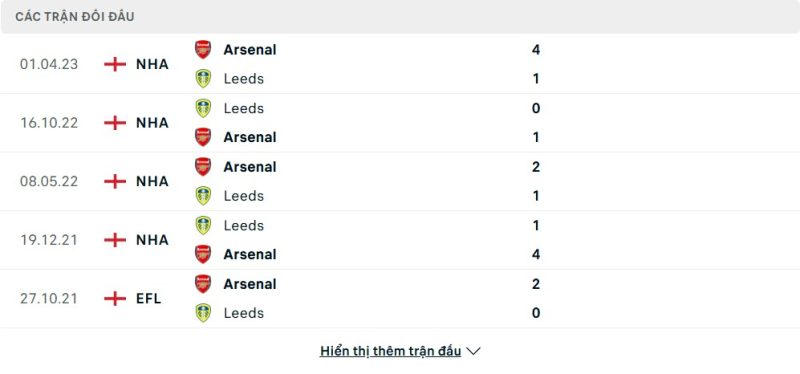 Thành tích đối đầu của Arsenal vs Leeds United