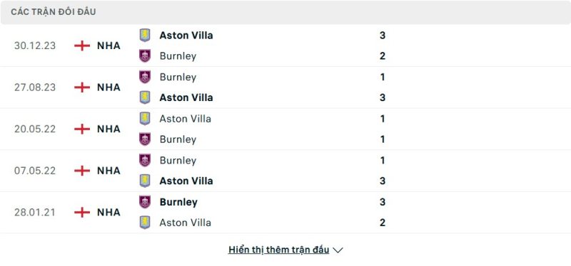 Thống kê phong độ gần đây Aston Villa vs Burnley