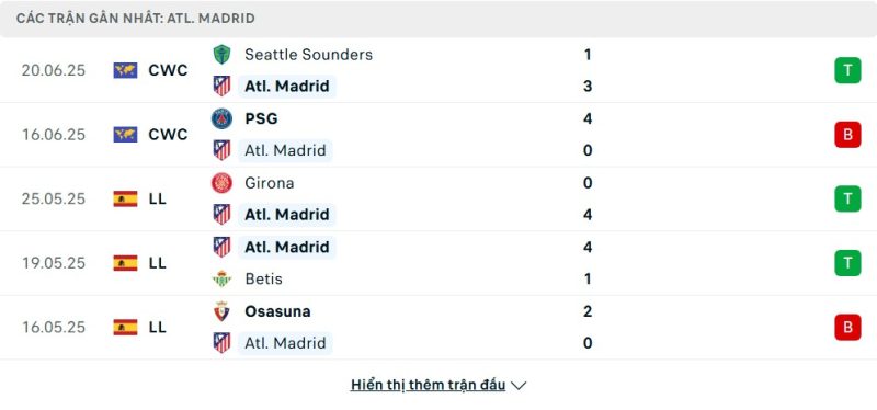 5 trận gần nhất của Atlético Madrid: W-L-W-W-L