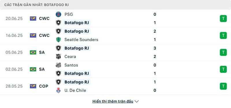 5 trận gần nhất của Botafogo: W-W-W-W-W