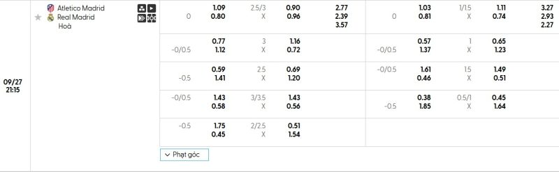 Bảng Tỷ lệ kèo bóng đá Atlético Madrid vs Real Madrid