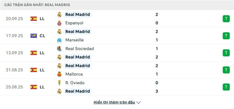 Real Madrid đang thể hiện một phong độ không thể ngăn cản. Thầy trò HLV Carlo Ancelotti đã toàn thắng tất cả các trận đấu tại La Liga từ đầu mùa, chễm chệ trên ngôi đầu bảng xếp hạng. Sức mạnh của họ được thể hiện qua những chiến thắng thuyết phục như 2-0 trước Espanyol, 2-1 trước Real Sociedad hay 3-0 trước Real Oviedo. Chuỗi thành tích ấn tượng này, cộng thêm thắng lợi 2-1 trước Marseille ở đấu trường châu Âu, cho thấy “Kền kền trắng” đang vận hành một cách trơn tru và cực kỳ hiệu quả ở cả hàng công lẫn hàng thủ.
