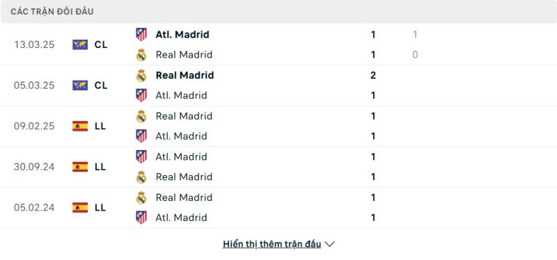 Thành tích đối đầu của Atlético Madrid vs Real Madrid