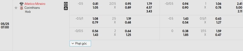 Bảng Tỷ lệ kèo bóng đá Atlético Mineiro vs Corinthians