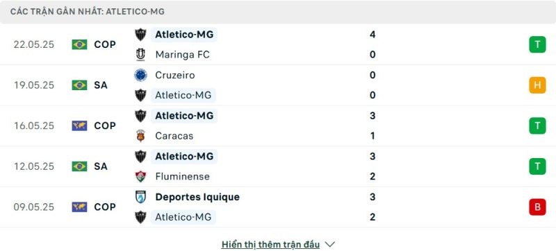 5 trận gần nhất của Atlético Mineiro: W-D-W-W-L