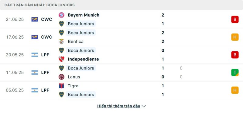 5 trận gần nhất của Boca Juniors: L-D-L-D-D