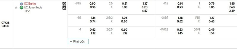 Bảng Tỷ lệ kèo bóng đá Bahia vs Juventude