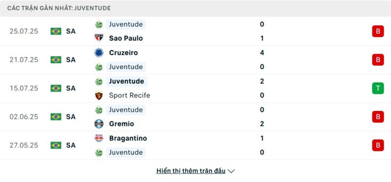 Bên kia chiến tuyến, Juventude rơi xuống vị trí thứ 18 với chỉ 11 điểm, lọt vào nhóm xuống hạng. Phong độ của đội bóng này hết sức bết bát, đặc biệt là trên sân khách. 5 vòng gần nhất, Juventude thua tới 4 trận, trong đó có thất bại nặng nề 0-4 trước Cruzeiro. Dù từng bất ngờ đánh bại Sport Recife, nhưng đó là điểm sáng hiếm hoi giữa chuỗi trận nghèo nàn của họ. Việc hàng công ghi bàn kém hiệu quả khiến Juventude gặp khó ngay cả khi đối đầu với các đội có hàng thủ không quá chắc chắn.