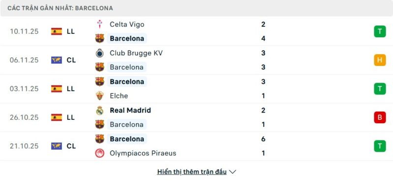 5 trận gần nhất của Barcelona: W-D-W-L-W