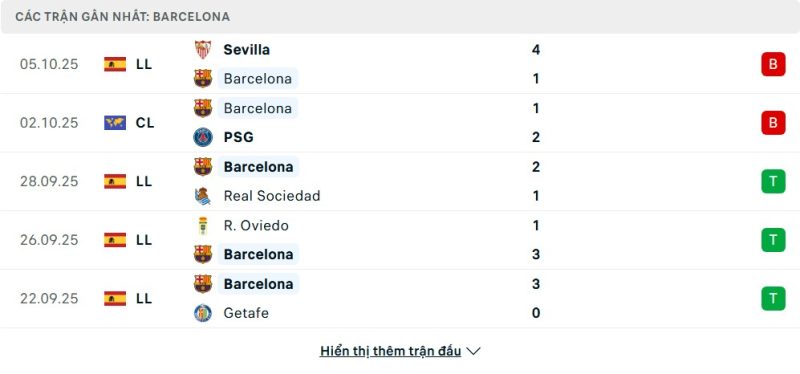 5 trận gần nhất của Barcelona: L-L-W-W-W
