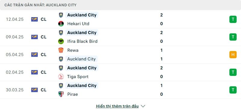 5 trận gần nhất của Auckland City: W-W-D-W-W