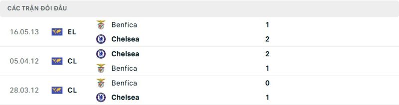 Thống kê phong độ gần đây Benfica vs Chelsea