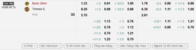 Dù được đánh giá cao hơn, Bodø/Glimt sẽ không dễ dàng áp đặt thế trận lên một Tromsø có tổ chức tốt. Nhiều khả năng, hai đội sẽ chơi đôi công ngay từ đầu, và bàn thắng có thể đến từ cả hai bên trong hiệp 1. Một tỷ số hòa ở 45 phút đầu tiên là kịch bản dễ xảy ra khi cả hai đều sở hữu hàng công sắc bén. Mức kèo tài xỉu mà nhà cái niêm yết là 1.25 với tỷ lệ cho tài là 0.88, tỷ lệ cho xỉu là 1.00, người chơi nên đặt niềm tin vào cửa tài cho hiệp đấu này.
