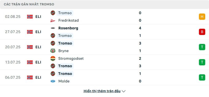 Bên kia chiến tuyến, Tromsø cũng đang có chuỗi trận đáng khen với 5 chiến thắng, 1 trận hòa và 1 trận thua trong 7 trận gần nhất. Họ thua Rosenborg 1-4, thắng Fredrikstad 1-0 và cầm hòa Fredrikstad 0-0 ở vòng gần nhất. Hiện đứng thứ 4 với 32 điểm, Tromsø cho thấy sự lì lợm và ổn định dù không phải đội có chiều sâu lực lượng mạnh. Họ thường gây bất ngờ nhờ sự gắn kết giữa các tuyến và khả năng tận dụng cơ hội hiệu quả.