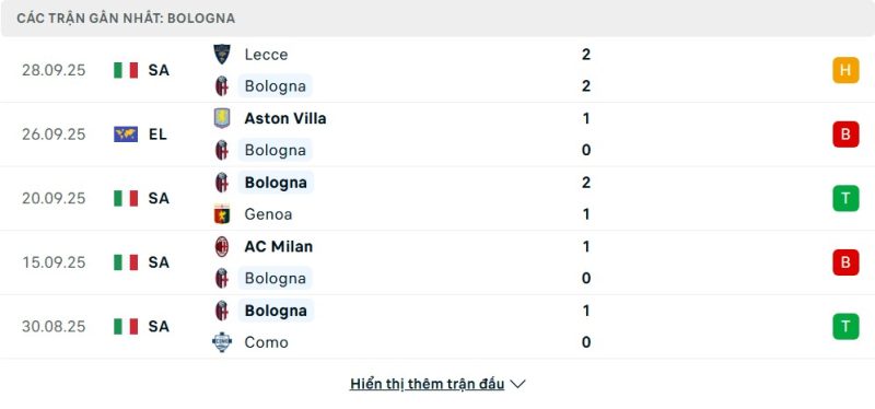 Bologna đang có khởi đầu mùa giải không thực sự thuyết phục khi kết quả thi đấu khá thất thường. Tại Serie A, họ đã có chiến thắng quan trọng trước Genoa và Como, song lại để thua Milan và Roma, khiến sự ổn định chưa được duy trì. Ở sân chơi Europa League, Bologna để thua Aston Villa trong trận ra quân, qua đó chỉ đứng ở nhóm cuối bảng xếp hạng. Dù vậy, những trận hòa như trước Lecce cho thấy tinh thần chiến đấu của Bologna vẫn còn hiện diện, và họ sẽ cần bứt phá nếu muốn trở lại cuộc đua tại cúp châu Âu.