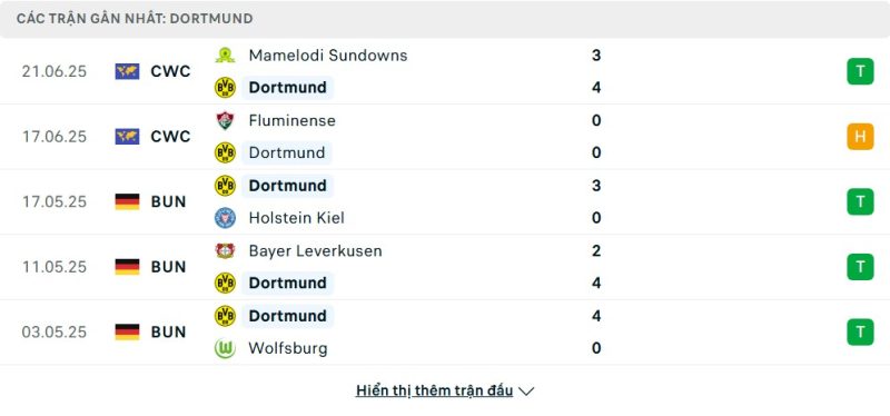 5 trận gần nhất của Borussia Dortmund: W-D-W-W-W