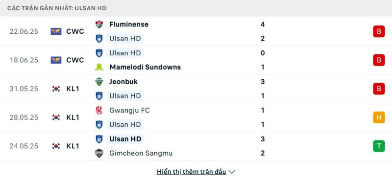 5 trận gần nhất của Ulsan HD: L-L-L-D-W