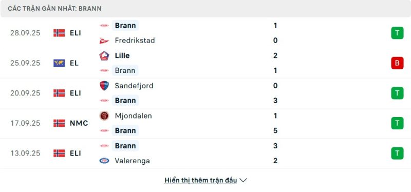 5 trận gần nhất của Brann: W-L-W-W-W
