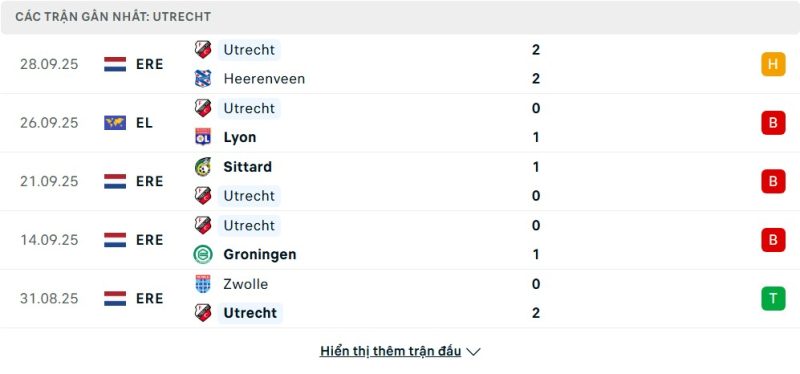 5 trận gần nhất của Utrecht: D-L-L-L-W