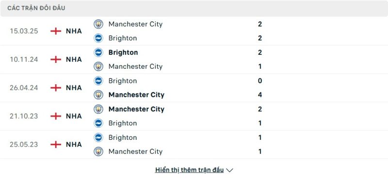 Thành tích đối đầu của Brighton & Hove Albion vs Manchester City