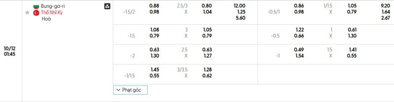 Bảng Tỷ lệ kèo bóng đá Bulgaria vs Thổ Nhĩ Kỳ