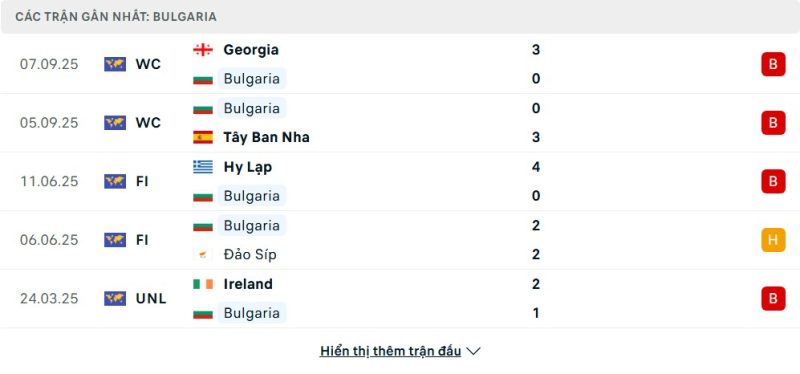 5 trận gần nhất của Bulgaria: L-L-L-D-L