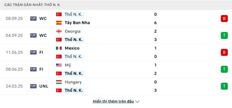 5 trận gần nhất của Thổ Nhĩ Kỳ: L-W-L-W-W