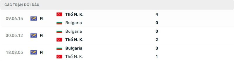 Thành tích đối đầu của Bulgaria vs Thổ Nhĩ Kỳ