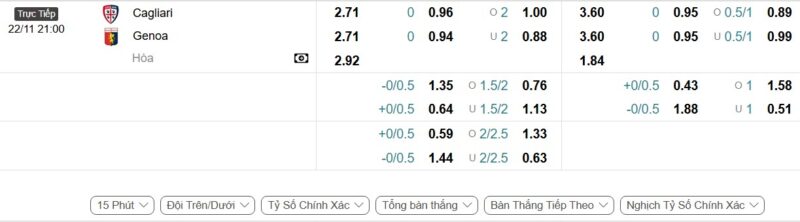 Bảng Tỷ lệ kèo bóng đá Cagliari vs Genoa