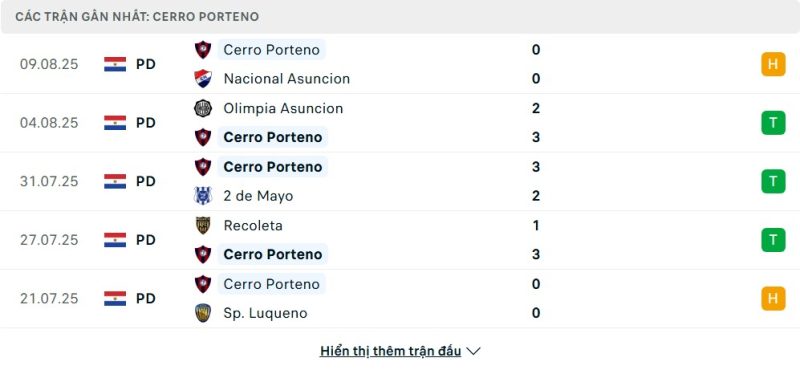 5 trận gần nhất của Cerro Porteño: D-W-W-W-D