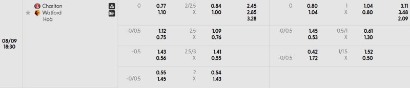 Bảng Tỷ lệ kèo bóng đá Charlton Athletic vs Watford