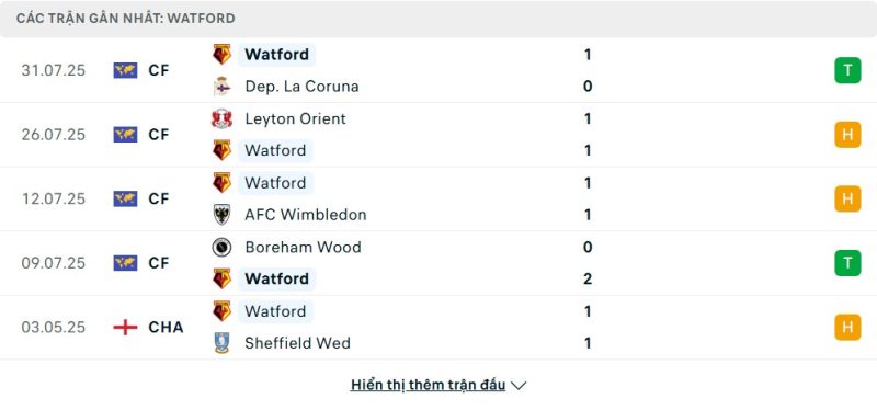Bên kia chiến tuyến, Watford khép lại mùa giải Championship 2024/25 ở nhóm giữa bảng xếp hạng, với phong độ thất thường. Hè này, họ có loạt trận giao hữu tương đối tốt, thắng Dep. La Coruna 1-0, Boreham Wood 2-0 và hòa AFC Wimbledon 1-1. Trước đó, ở cuối mùa trước, Watford đánh bại Hull 1-0 và Sheffield Wed 1-0, nhưng cũng nhận nhiều thất bại như 1-2 trước Burnley hay 0-1 trước Portsmouth. Dù không quá bùng nổ, Watford vẫn giữ được khả năng thi đấu chắc chắn trước các đối thủ vừa sức.