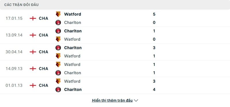 Thành tích đối đầu của Charlton Athletic vs Watford