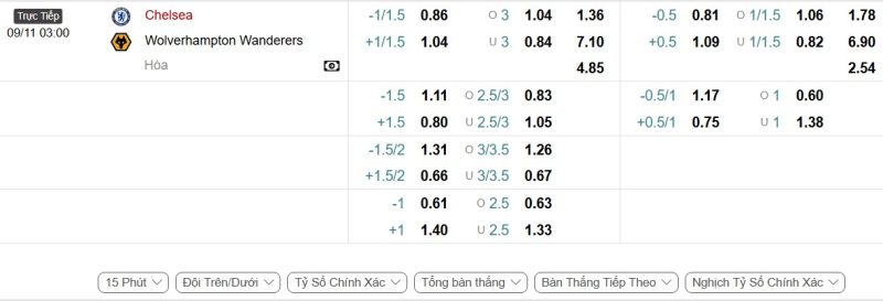 - Kèo tỷ số bóng đá hiệp 1: Chelsea 1-0 Wolverhampton Wanderers