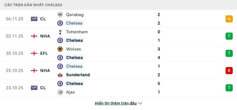 Thống kê phong độ gần đây Chelsea vs Wolverhampton Wanderers