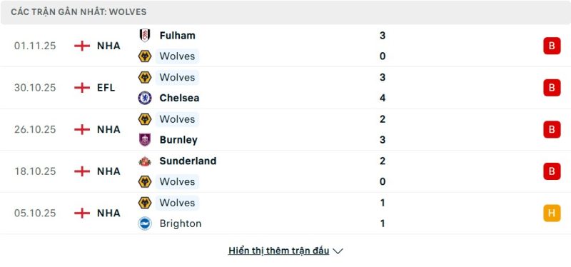 5 trận gần nhất của Wolverhampton Wanderers: L-L-L-L-D