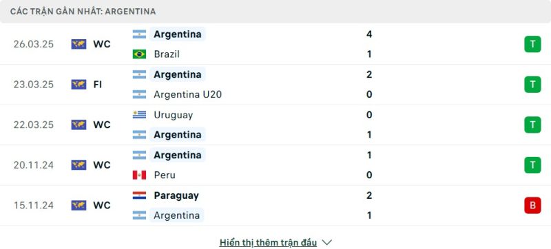 5 trận gần nhất của Argentina: W-W-W-W-L