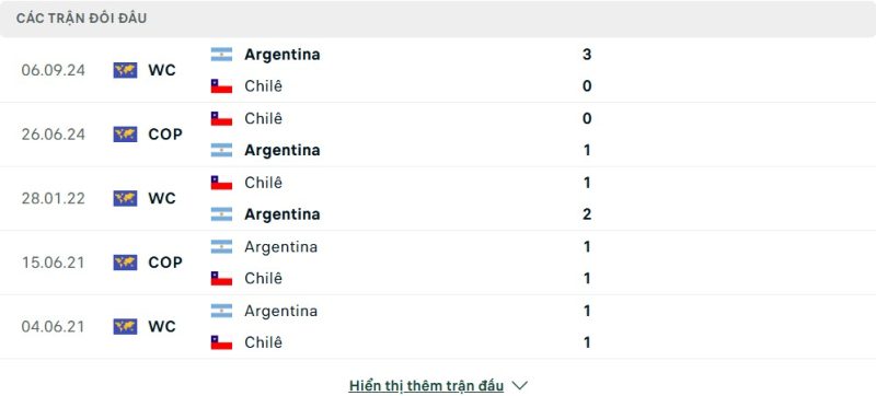 Thống kê đối đầu giữa hai đội càng làm nổi bật sự vượt trội của Argentina. Trong 6 lần gặp nhau gần nhất, Argentina bất bại, trong đó có 3 chiến thắng và 3 trận hòa. Dù vậy, điểm đáng lưu ý là 4/6 trận gần đây giữa hai đội có ít hơn 3 bàn thắng, cho thấy những cuộc đối đầu này thường diễn ra căng thẳng, thực dụng và không có nhiều khoảng trống để bùng nổ.