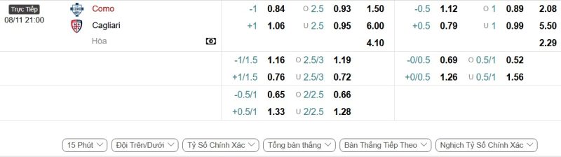 - Kèo tỷ số bóng đá hiệp 1: Como 2-0 Cagliari
