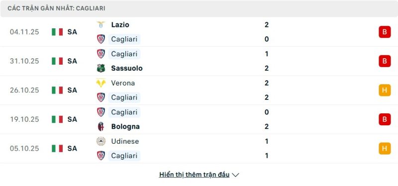 5 trận gần nhất của Cagliari: L-L-D-L-D