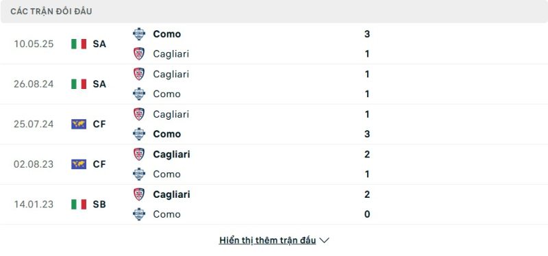 Thành tích đối đầu của Como vs Cagliari