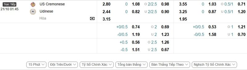 Bảng Tỷ lệ kèo bóng đá Cremonese vs Udinese